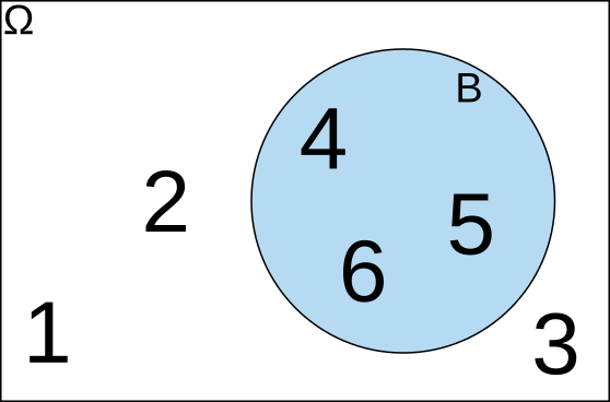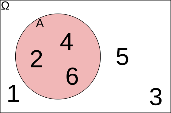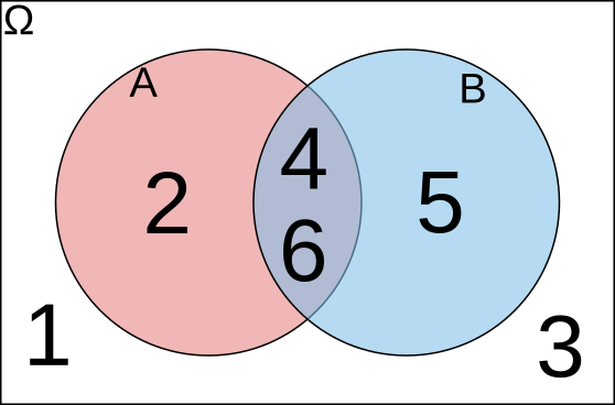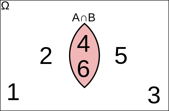Si A es "sacar un número par" y B es "sacar un número mayor que 3", la intersección \(A \cap B = \{4, 6\}\)
