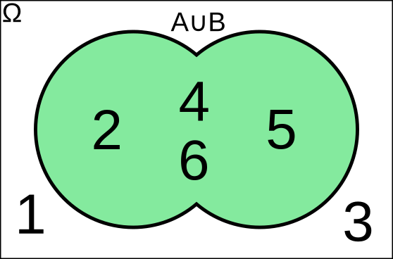 Si \(A\) es "sacar un número par" y \(B\) es "sacar un número mayor que 3", la unión \(A \cup B = \{2, 4, 5, 6\}\).