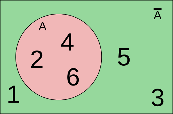Por ejemplo, si \(A\) es "sacar un número par", el complemento es \(\overline{A}\) = "sacar un número impar".